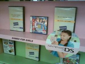 While browsing the Nintendo section of our local Blockbuster last Friday night, my boyfriend and I came across a small section called Games for Girls. I was appalled by the pink shelving, the games chosen just for us, and even the young girl with her cute little braids and pink DS.